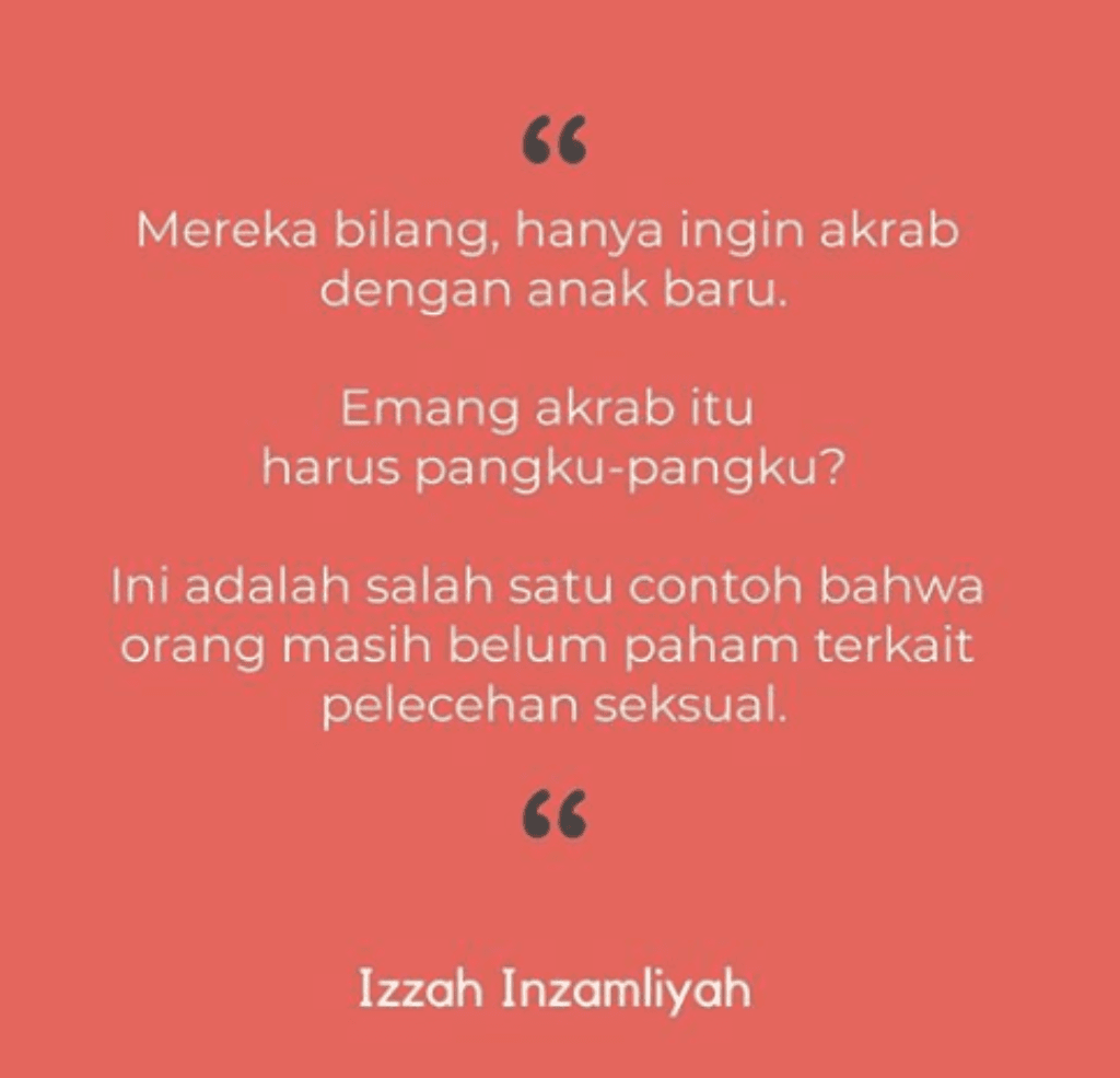 Mereka bilang, hanya ingin akrab dengan anak baru. Emang akrab itu harus pangku-pangku? Ini adalah salah satu contoh bahwa orang masih belum paham terkait pelecehan seksual