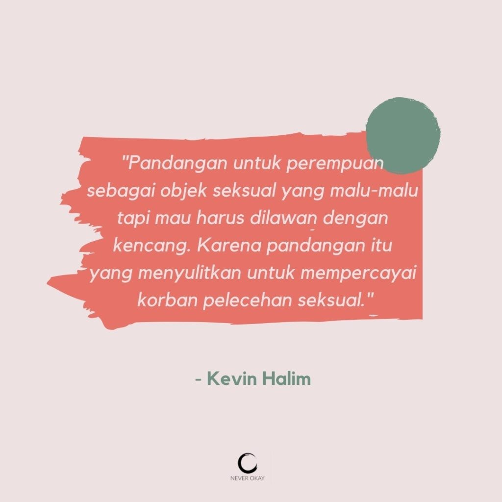 Kevin menekankan bahwa pandangan untuk perempuan sebagai objek seksual yang malu-malu tapi mau harus dilawan dengan kencang. Karena pandangan itu yang menyulitkan untuk mempercayai korban pelecehan seksual.
