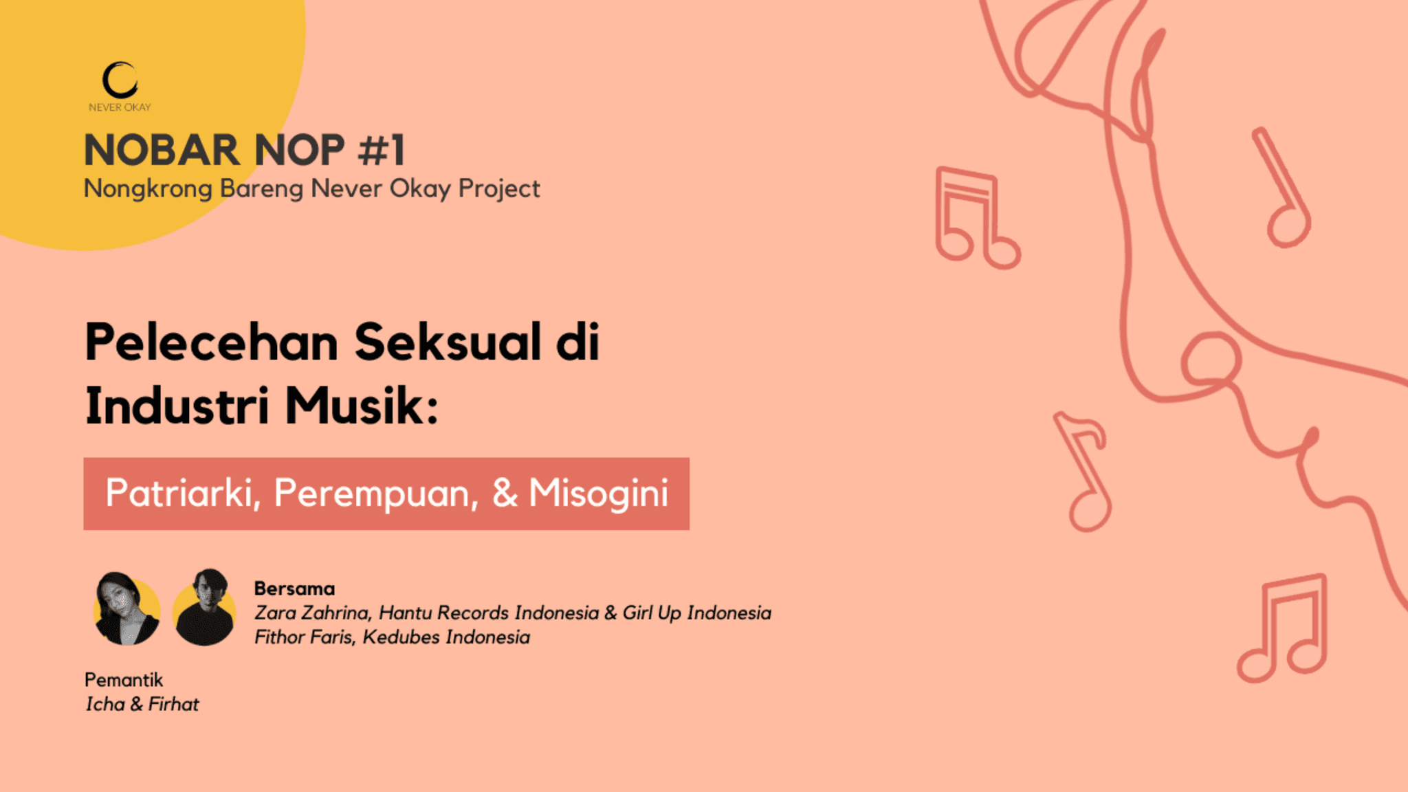 Sabtu (27/10), diadakan NOBAR NOP #1 (Nongkrong Bareng Never Okay Project), sebuah seri diskusi daring bertemakan pelecehan seksual di berbagai sektor industri kerja. Episode pertama ini membahas tentang pelecehan seksual di industri musik. Narasumber yang hadir di NOBAR ini ialah Zara Zahrina dari Hantu Records & Publishing dan Girl Up Indonesia dan Fithor Faris, seorang musisi dari Kedubes Bekasi. Hadir pula Firhat dan Icha dari Never Okay Project sebagai pemantik diskusi soal pelecehan seksual di industri musik ini.