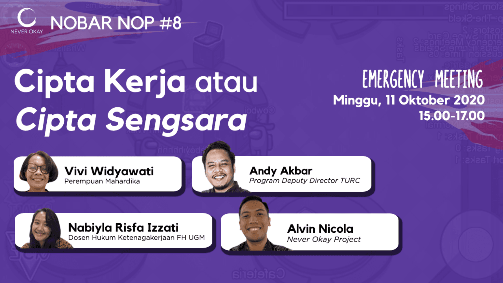Sebagai upaya memperluas dukungan terhadap penolakan disahkannya Omnibus Law RUU Cipta Kerja, maka di Minggu (10/10/2020) diadakanlah NOBAR NOP #8 (Nongkrong Bareng Never Okay Project) yang bertajuk “Emergency Meeting: Cipta Kerja atau Cipta Sengsara?”