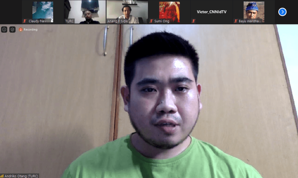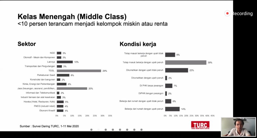 Anang F Sidik selaku staff data academy TURC memaparkan hasil temuan survei yang rentang demografi wilayahnya tersebar di seluruh Indonesia dengan mayoritas di Jawa Barat, DKI Jakarta, dan Jawa Tengah dalam aspek kondisi kerja di tengah pandemi COVID-19 yakni, 68% perusahaan menutup kegiatan sementara selama COVID-19, namun paling besar dari responden tetap masuk bekerja dengan upah penuh (38%) dan dirumahkan dengan upah tidak penuh (21%). Kemudian dampak PHK di sektor TGSL (Tekstil, Garmen, Sepatu, dan Alas Kaki) terlihat menonjol dari sektor lain sebesar 32% tanpa pesangon dan 40% dengan pesangon dibandingkan sektor industri lainnya. Sedangkan yang terdampak work from home (WFH) dengan upah tidak penuh paling besar pada sektor Informasi dan Telekomunikasi (50%). Temuan lainnya yang menarik dari kondisi kerja selama pandemi COVID-19 yakni, calon kelas menengah (aspiring middle class) dimana >10% terancam menjadi kelompok miskin dan >10% menjadi kelompok rawan (vulnerable).