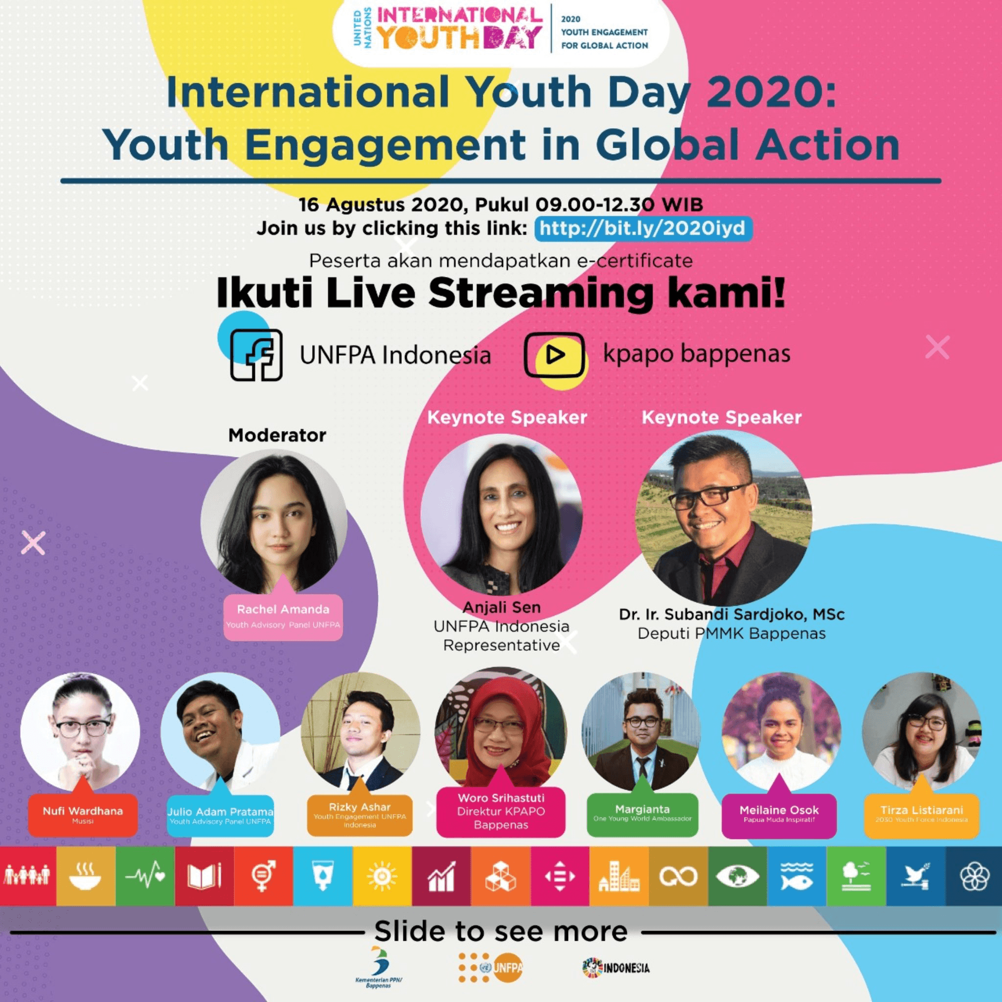 Agenda International Youth Day 2020 ini membahas keterlibatan pemuda dalam mengatasi tantangan dan permasalahan kemanusiaan di masa pandemi COVID-19.