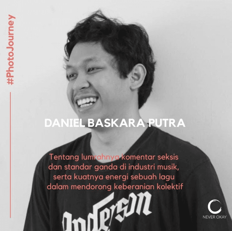 Baskara is grateful he never worked in a sexist environment before fully entering the music industry. However, after hearing the Never Okay Project survey results that 94% of respondents reported experiencing sexual harassment in the workplace, he began to doubt his understanding all this time. What Baskara fears is that this phenomenon occurs in the environment where he previously worked, but he did not realize it. Baskara stated that this unawareness could be because he is a man, and therefore the lack of sensitivity to the phenomenon could happen. He argues that it is not impossible because of the strong power relations making the phenomena unheard by him, as it has been suppressed by more powerful forces.